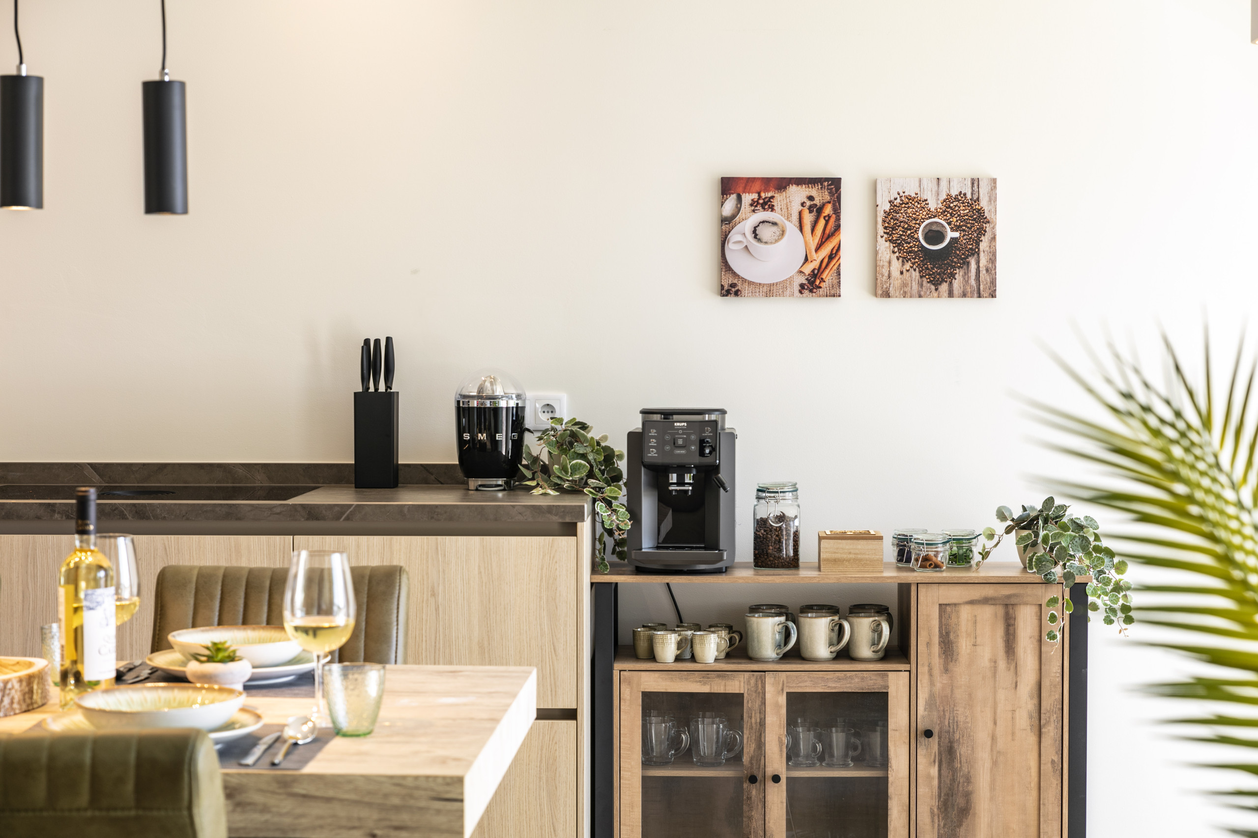 De Amerikaanse keuken is volledig uitgerust met moderne voorzieningen, waaronder een inductiekookplaat, oven, magnetron, vaatwasser, koffiemachine en essentieel keukengerei. Geniet van het bereiden van maaltijden met hoogwaardige apparaten en samen eten in de speciale eetruimte.