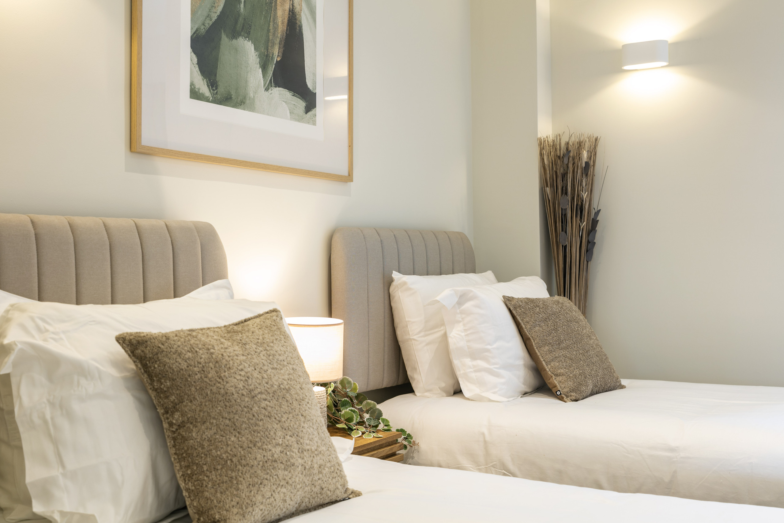 De woning beschikt over twee comfortabele slaapkamers met premium beddengoed, waaronder één kingsize bed en twee individuele bedden, wat zorgt voor een rustvolle nachtrust. Twee privébadkamers met drempelloze toegang en douchevoorzieningen bieden gemak en comfort voor alle gasten.