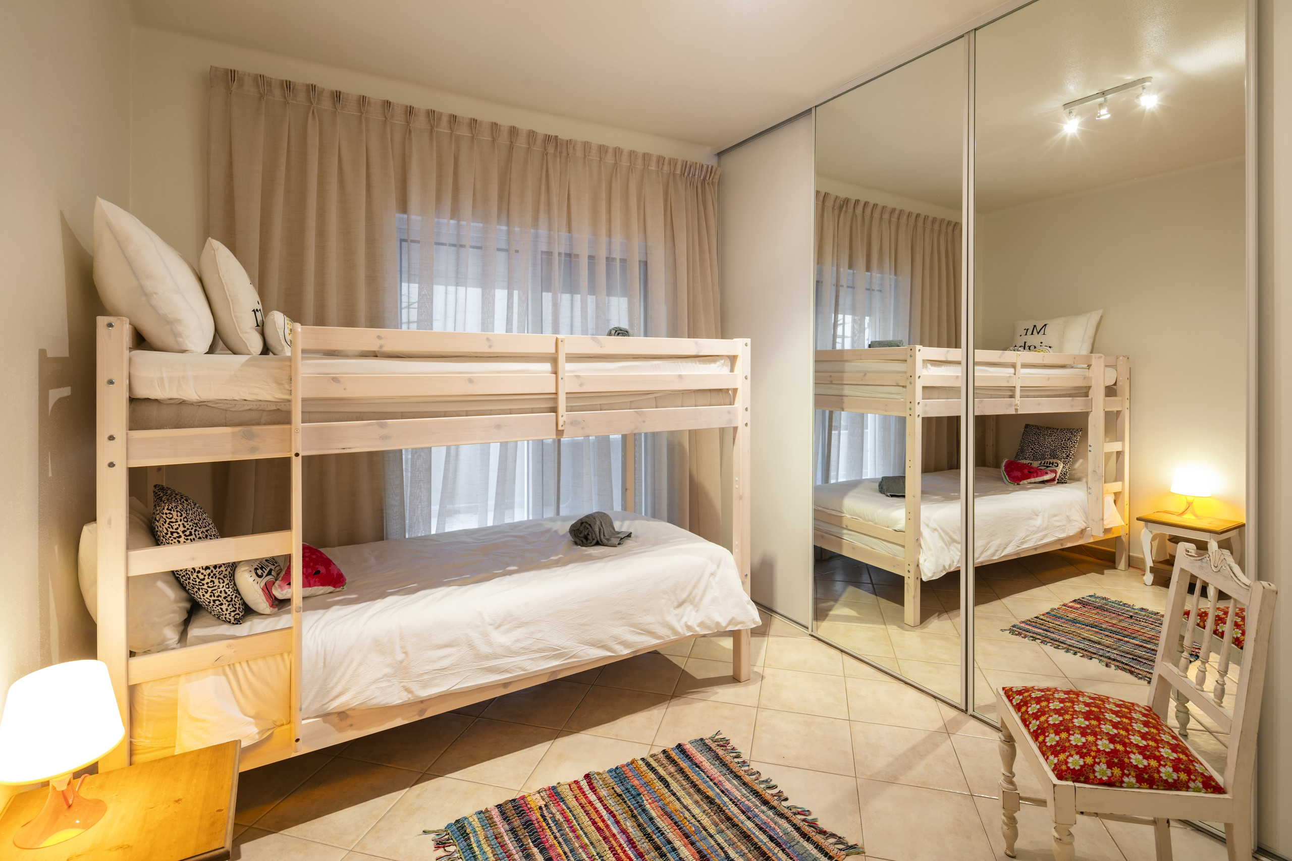 Het appartement beschikt over 3 comfortabele slaapkamers met in totaal 4 bedden, geschikt voor maximaal 6 gasten. De slaapplaatsen bestaan uit een queensize bed, een stapelbed en twee eenpersoonsbedden, zodat iedereen een rustige nacht kan slapen op onze premium matrassen met kussensloop.