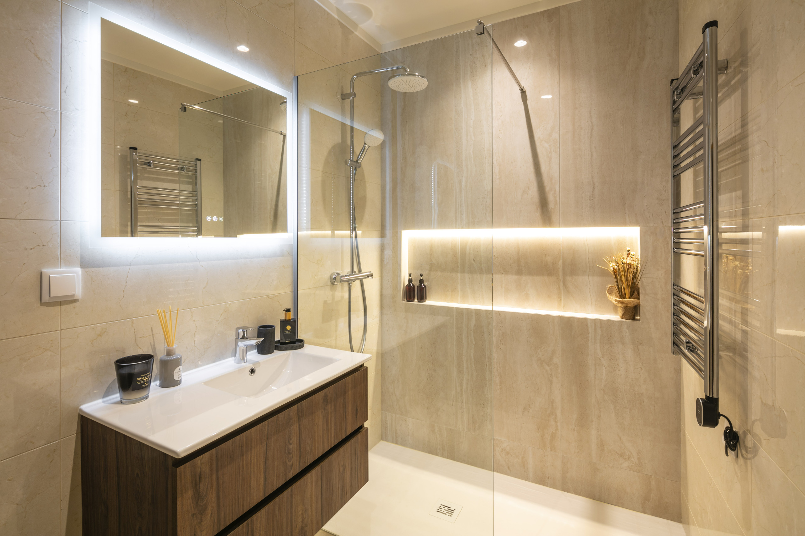 This apartment has two bathrooms. The first bathroom has a bath, a show enclosure, a double sink, toilet and a bidet. The second bathroom is equipped with a shower, toilet and single sink.