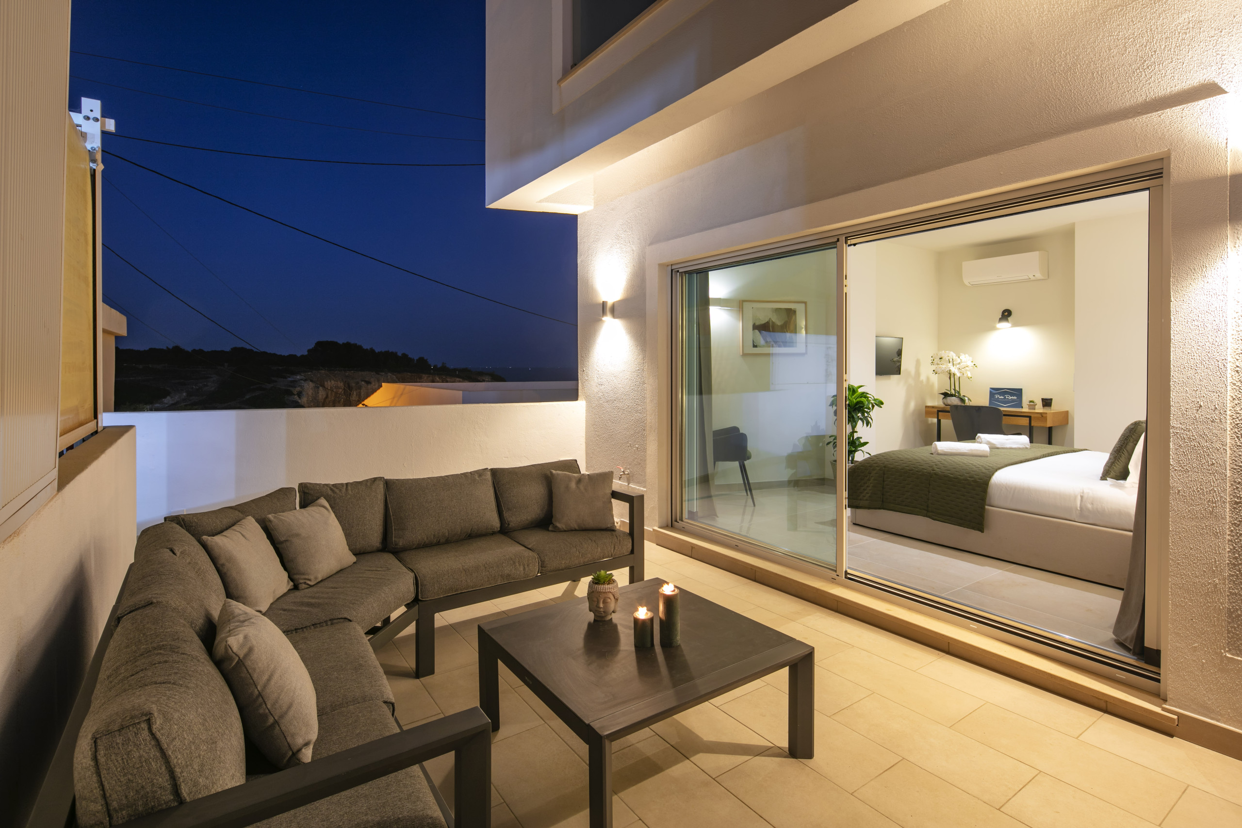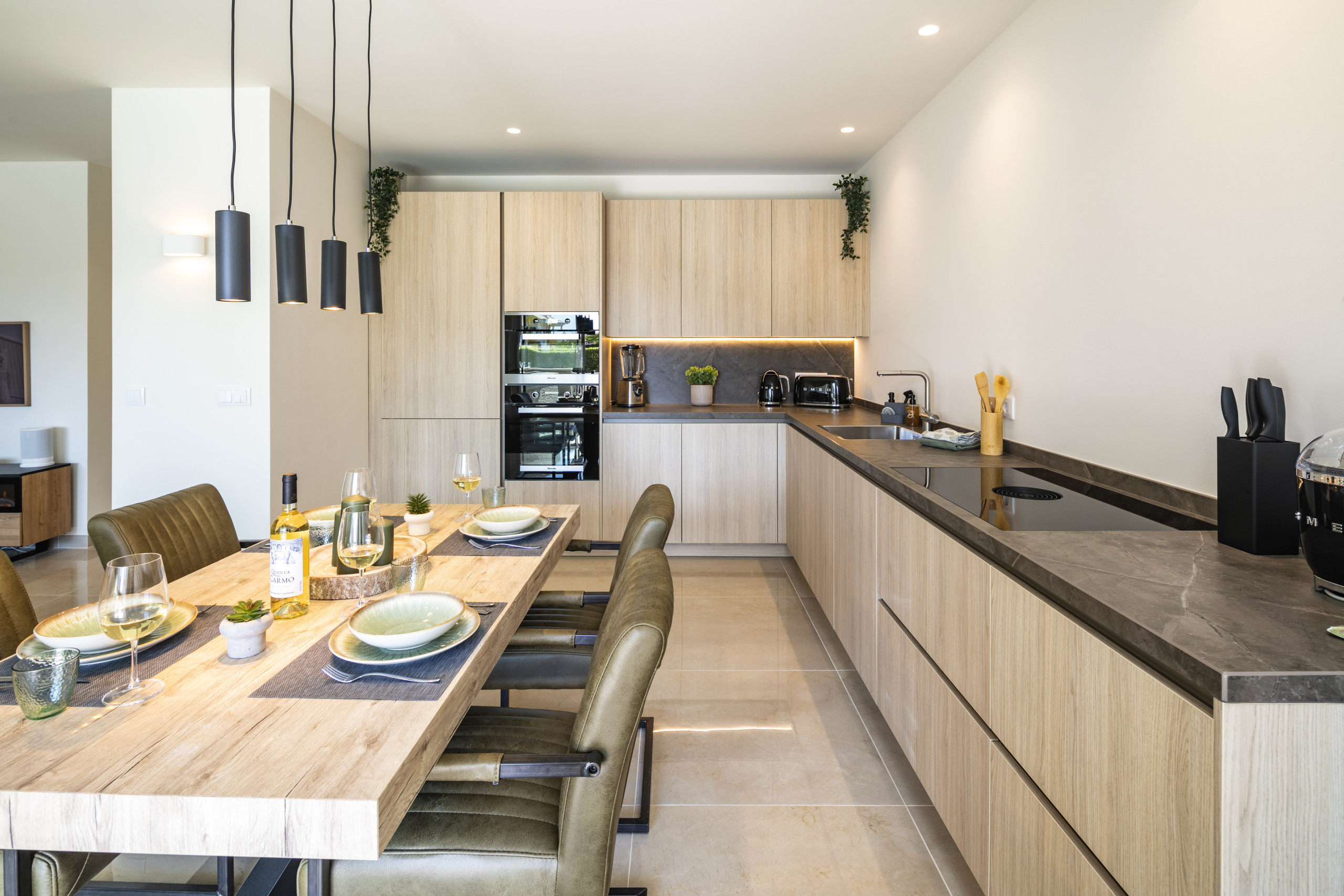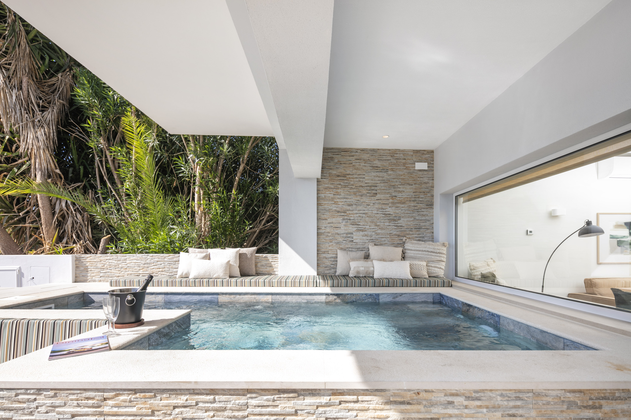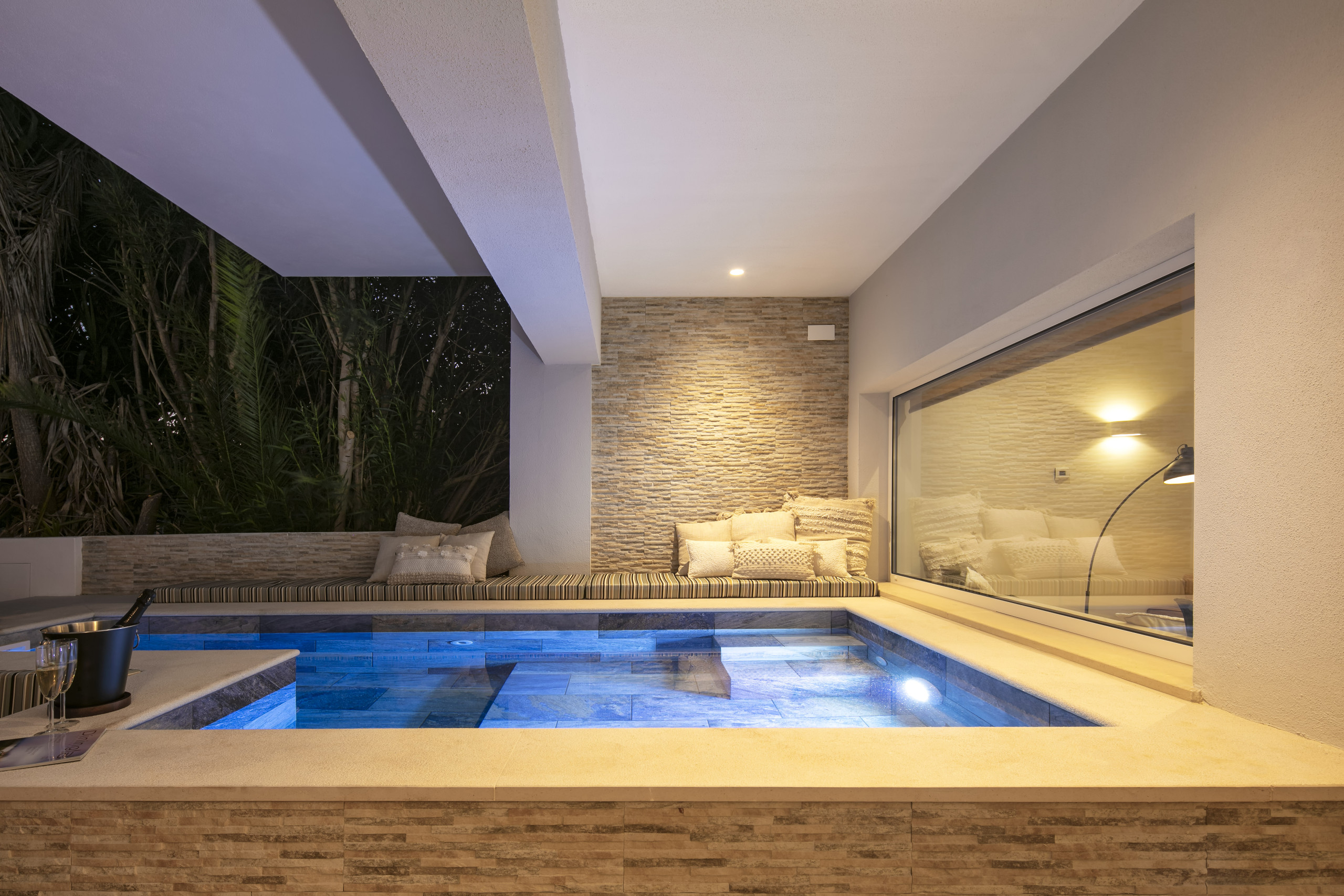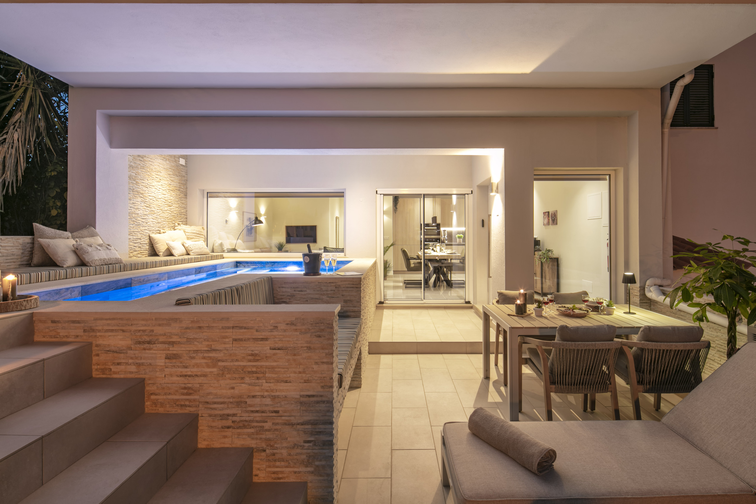The living room is furbished with stylish and comfortable furniture. The sliding doors lead to the big terraces with the pool in front of it. A separate dining area is connected to the living room and offers seating for 6 people. The living room is equipped with air conditioning and a fire place.