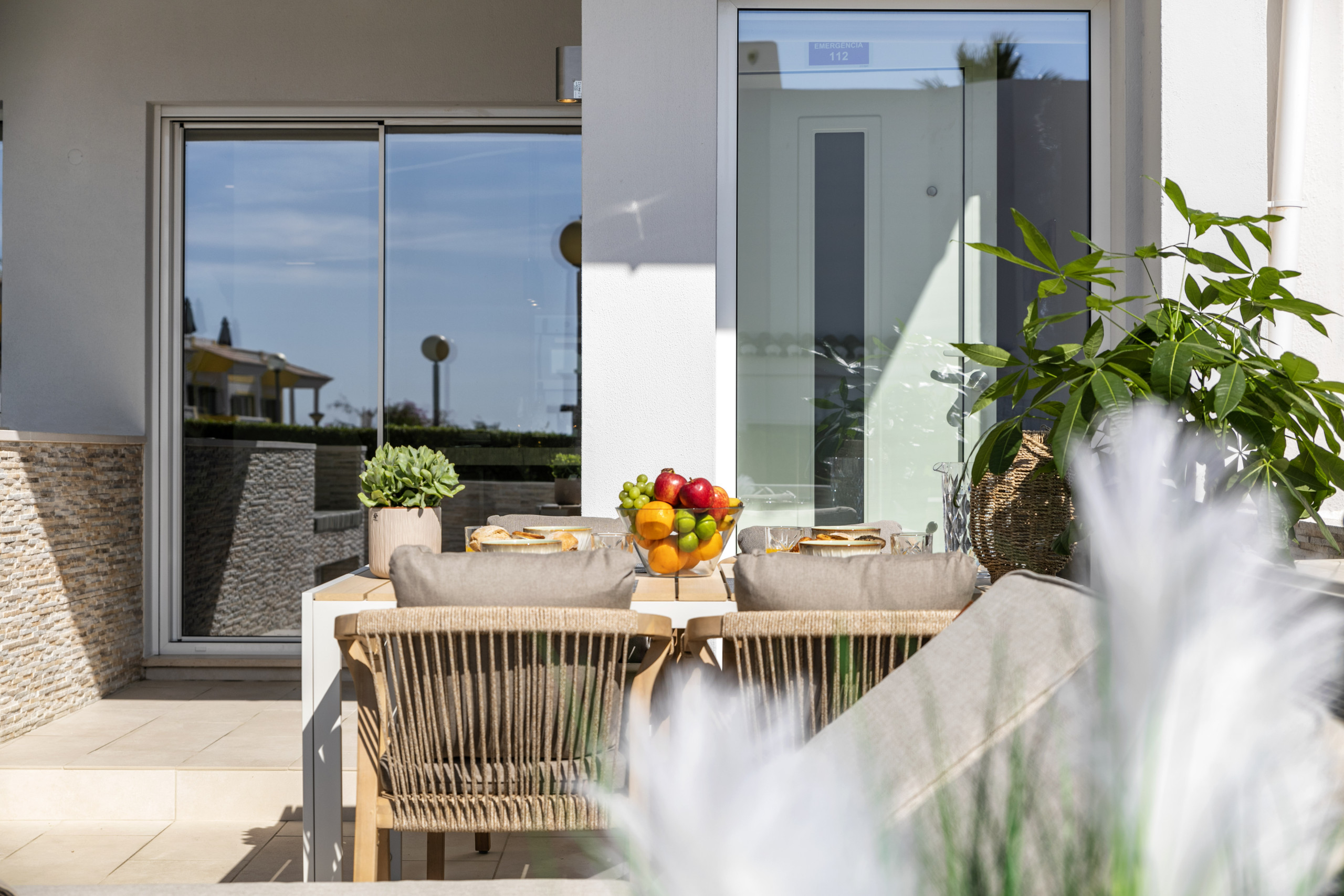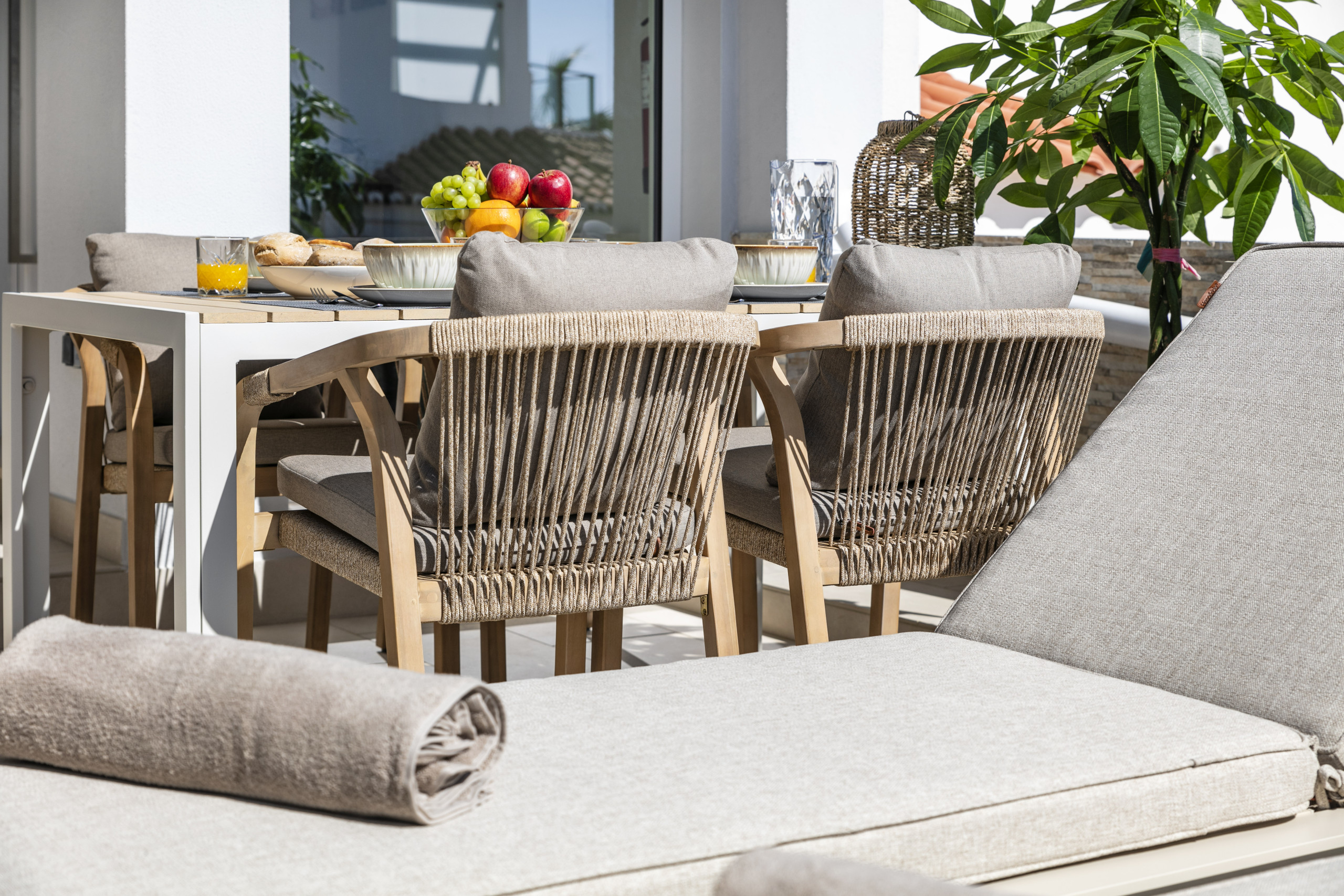 Outside on the terrace you can sit around the table with your family and enjoy the lovely ocean views. Really a great spot to relax and the beach is only 175m away.