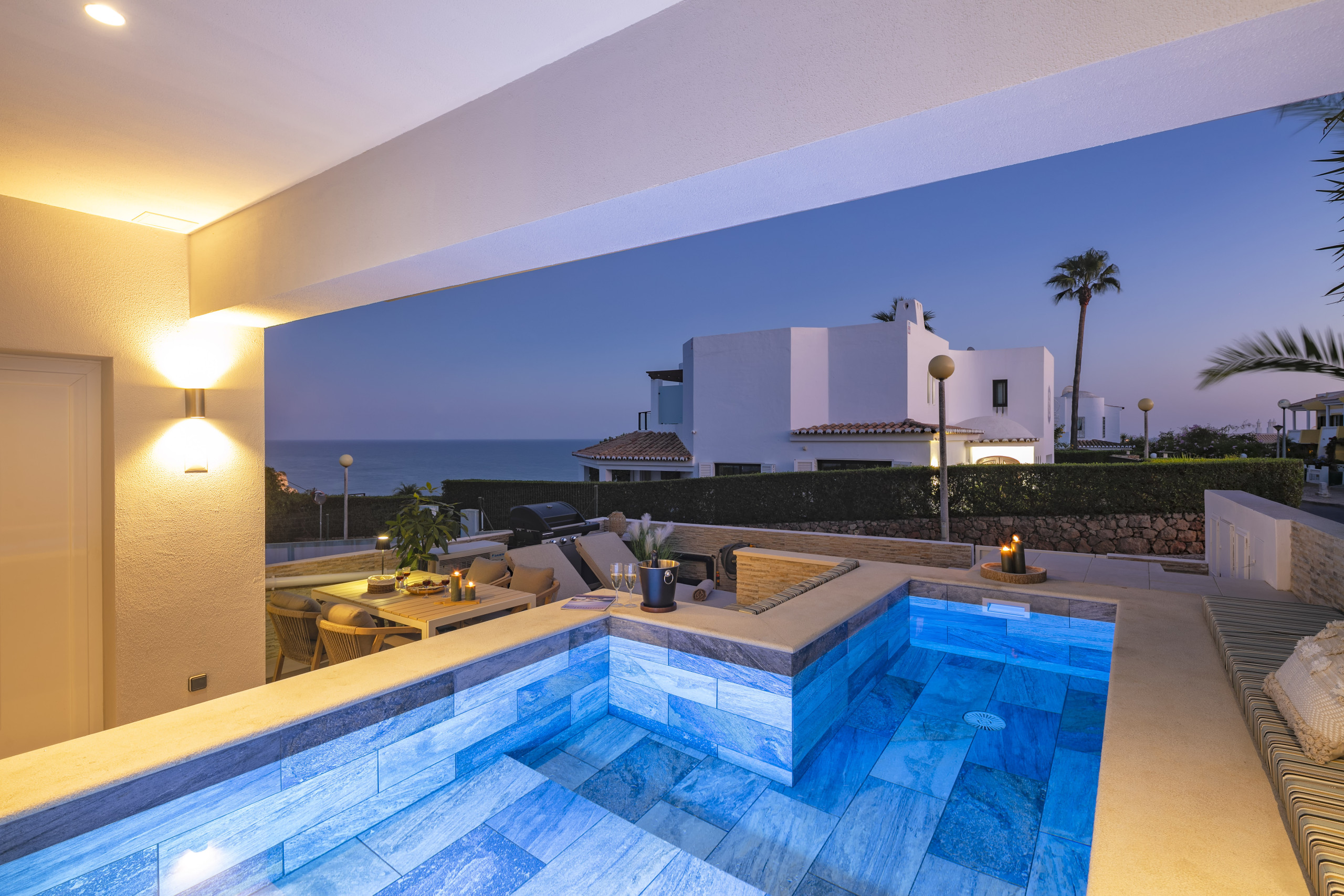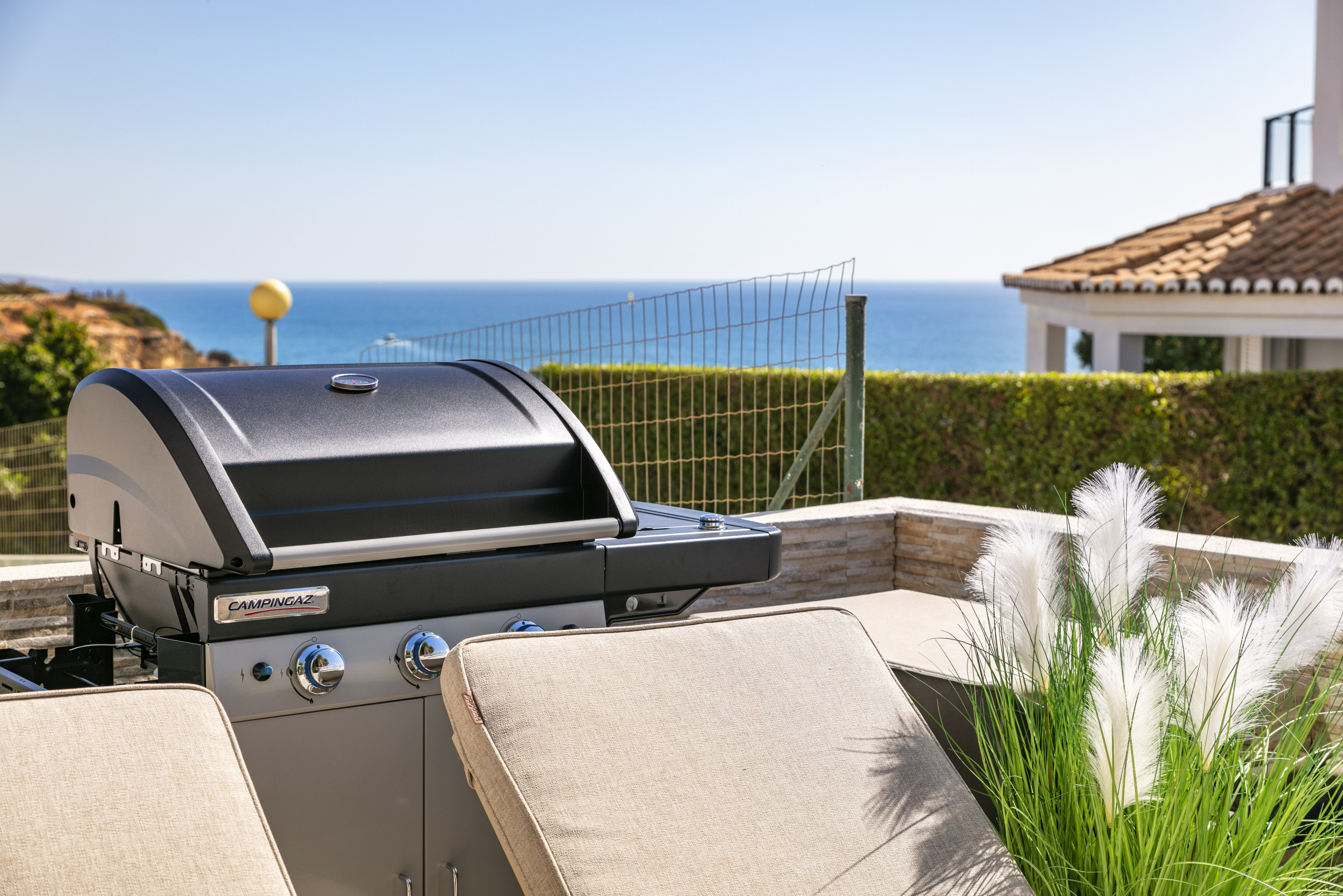 Relax in the spacious living room with a smart TV and entertainment options. The property boasts a private heated plunge pool with stunning ocean views, perfect for cooling off on warm days. Outdoor enthusiasts will appreciate the barbecue area, garden furniture, and fenced plot.
