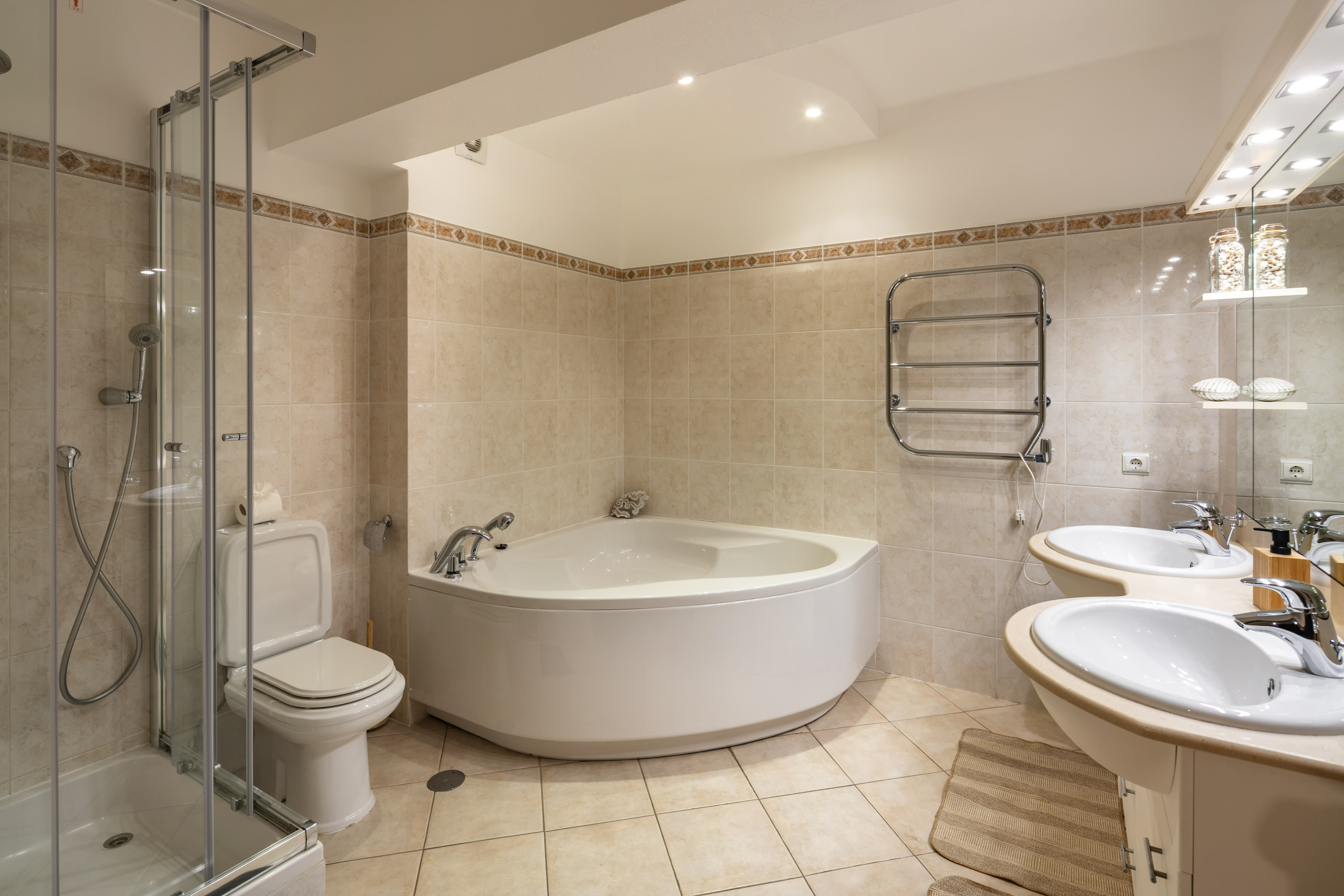 Two well-appointed bathrooms serve the property, with one featuring a refreshing shower and the other offering a relaxing bathtub. Both are equipped with essential amenities and feature handled shower heads for added convenience.